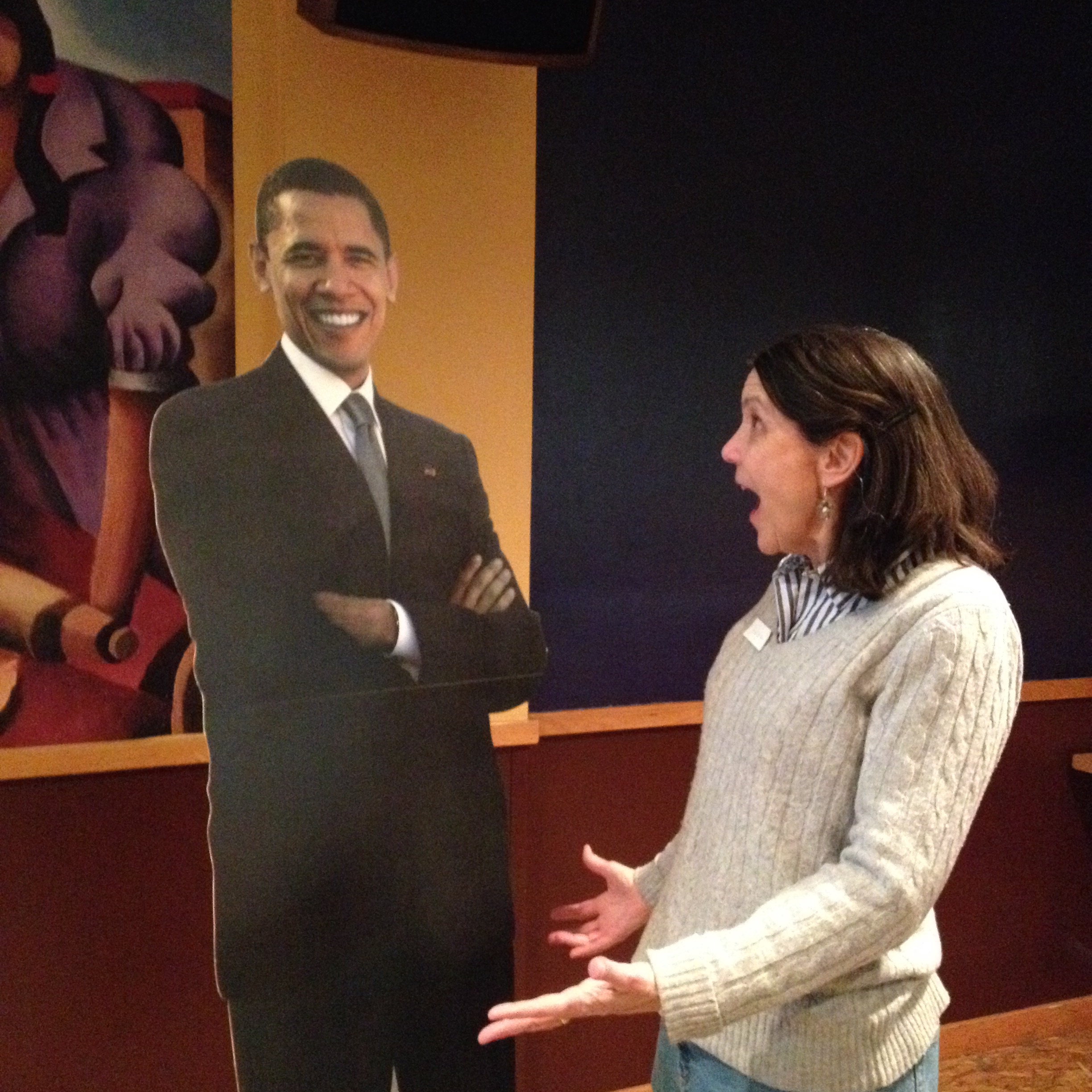 Sometimes questions and problems lead to new solutions. Our Conversation Cafe attendance was lagging a bit in January and February so we, the Bridges International team at Kansas State University, decided to advertise at the dining centers. We wondered what we could do to attract attention that was different from all the other tables students encounter. After brainstorming, we felt we landed on a few good solutions. We would buy a life-size cutout of President Obama and provide from some photo opportunities. At the other dining center, we decided to play, “Name that Flag.” At both we would offer a raffle for coffee shop gift cards.
