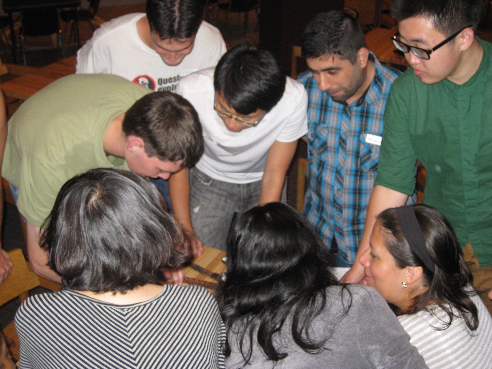 Each person writes the name of a famous person on a piece of paper. The person can be real or fictional, alive or dead. It is helpful if everyone knows the name. The papers are collected and read aloud two times by someone who is not familiar with everyone’s handwriting or who is not playing the game. One designated person asks another person if they are one of the names read. For example, Tiffany might ask Liming if she is Hillary Clinton. If Liming says “yes,” then she sits by Tiffany and together they ask another person. If Liming says, “no,” then Liming stays where she is at and asks another person about a name. This game continues until all have been guessed. The teams get larger when individuals and whole teams are guessed.