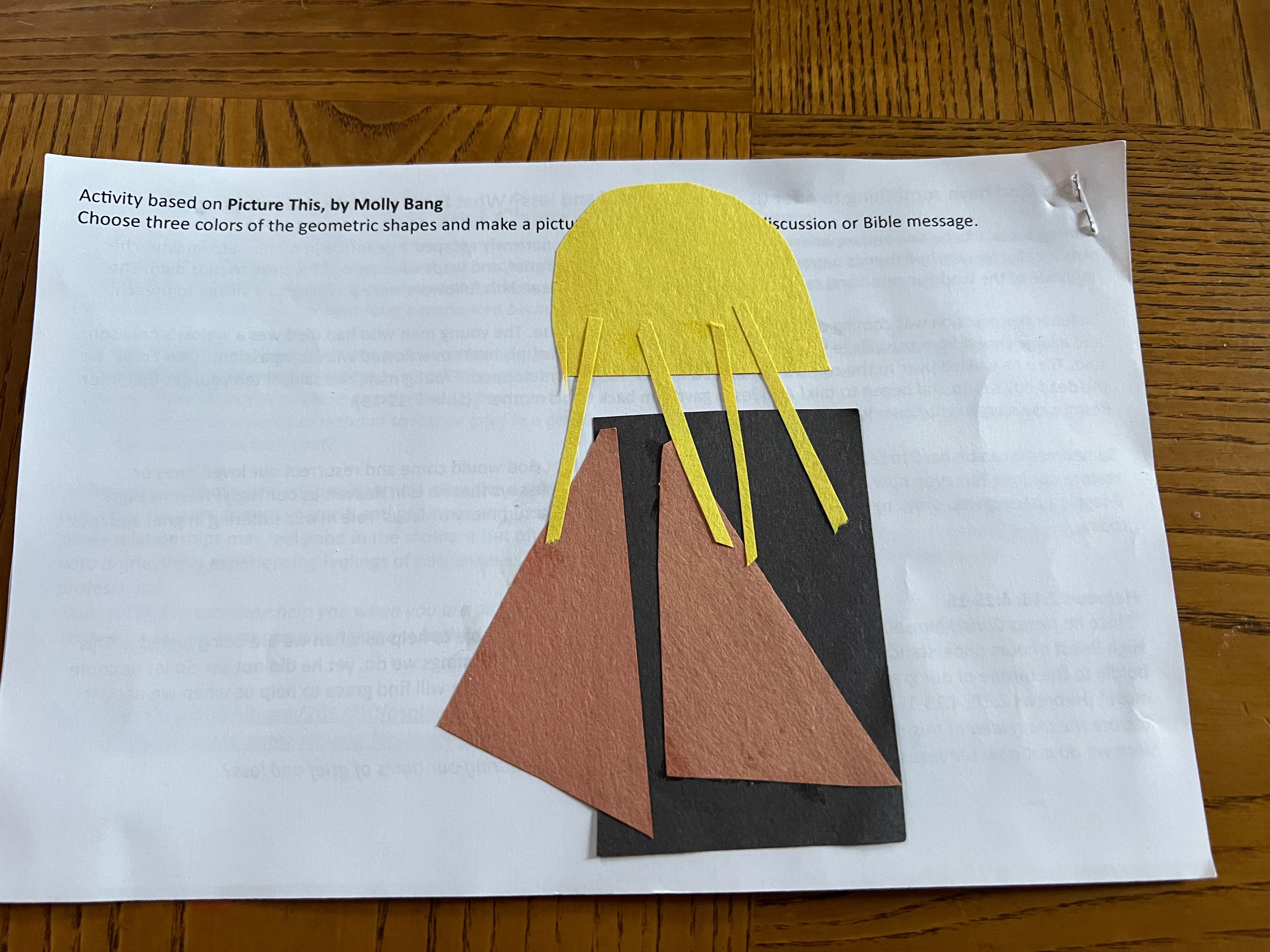 Chai and Chat is a weekly meeting we (Bridges International) host for international students at Kansas State University. This fall, we tackled the topic of mental health by defining terms, listing resources, and reading and discussing what the Bible says about these topics. We ended each session with an art project using geometric shapes of three colors glued to a piece of paper. (We followed the method demonstrated and explained in Picture This, by Molly Bang.) Then we shared what we created. Some of the images reflected their own experience with things like anxiety and depression. Others retold the story or advice from the Bible. The discussion guides are now available from the tab at the top of this page. I hope you find them helpful.